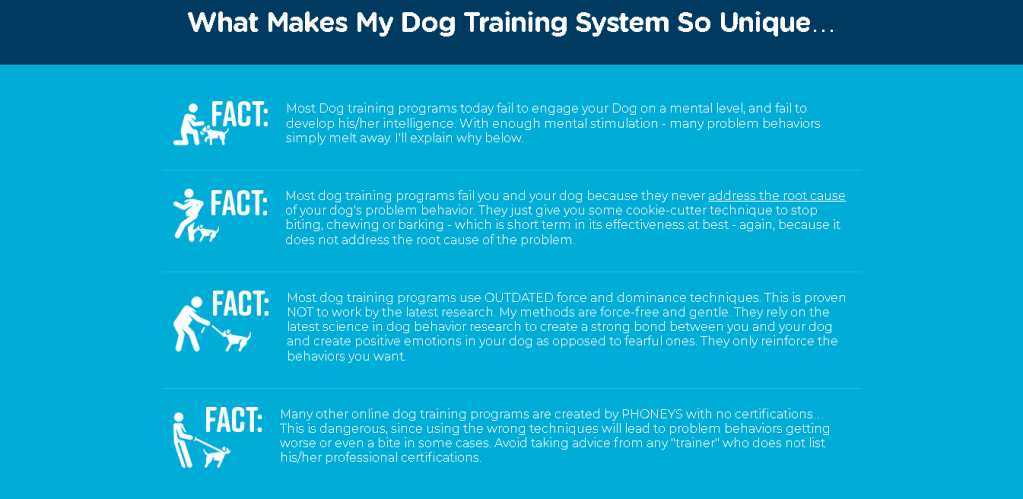 Because you get a simple-to-follow process. Ask any successful dog trainer and they will tell you that simplicity is the key to training a well-behaved dog. My system is so easy to follow; it virtually tells you everything you need to do to make any dog well behaved with no behavioral problems.