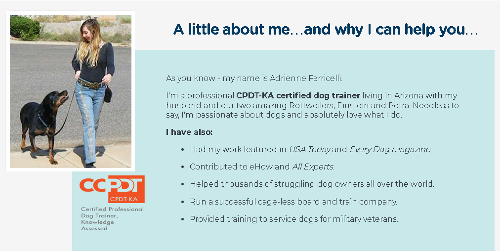 My name is Adrienne Farricelli, I’m a professional CPDT-KA certified dog trainer, and for the last 10 years I’ve been helping people to eliminate bad behaviors in dogs and train well behaved, obedient, loving pets…by showing them how to bring out the ‘hidden intelligence’ inside their dog.